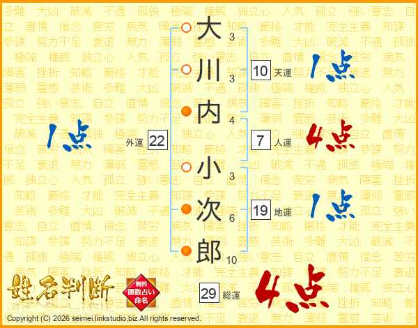 大(3画)川(3画)内(4画) 小(3画)次(6画)郎(10画)