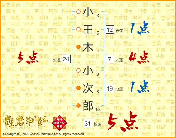 小(3画)田(5画)木(4画) 小(3画)次(6画)郎(10画)