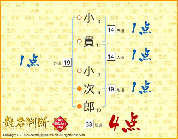 小貫小次郎さんの総運は33画の4点!