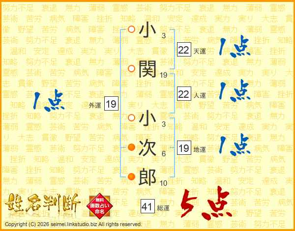 小(3画)関(19画) 小(3画)次(6画)郎(10画)