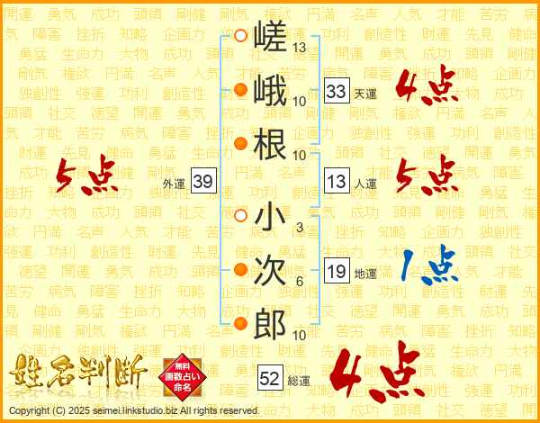 嵯(13画)峨(10画)根(10画) 小(3画)次(6画)郎(10画)