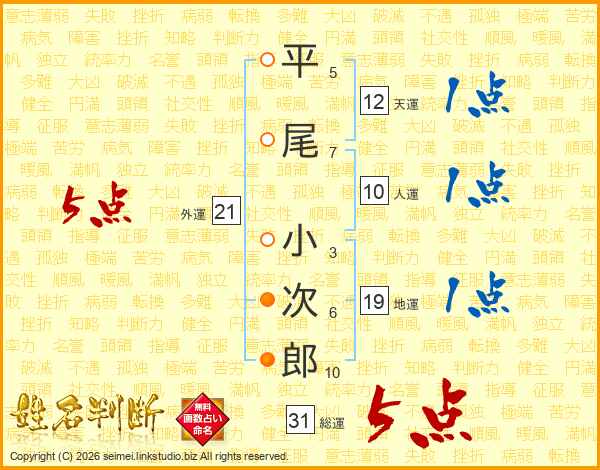 平(5画)尾(7画) 小(3画)次(6画)郎(10画)