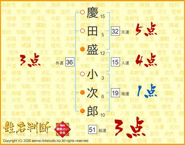 慶(15画)田(5画)盛(12画) 小(3画)次(6画)郎(10画)