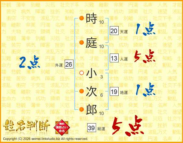 生活面を象徴する運勢です。外部から受ける影響力を表し、結婚運、家庭運や職場、環境への順応性を表します。総運から人運を引いた画数。姓や名が1文字の場合を除く。