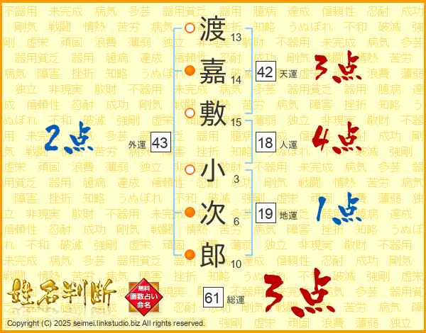 渡(13画)嘉(14画)敷(15画) 小(3画)次(6画)郎(10画)