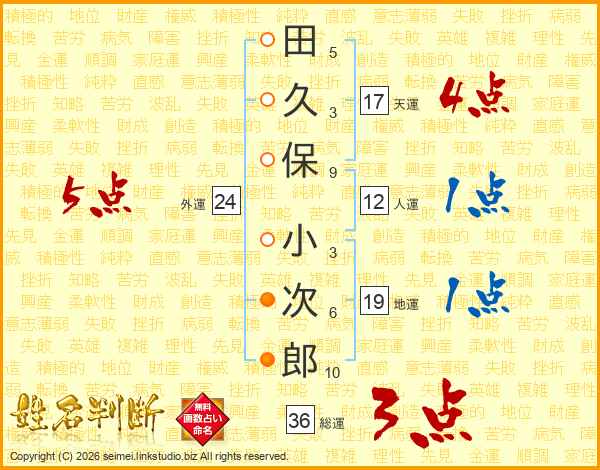 田(5画)久(3画)保(9画) 小(3画)次(6画)郎(10画)