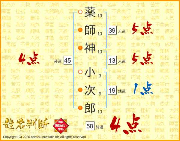 薬師神小次郎さんの総運は58画の4点!