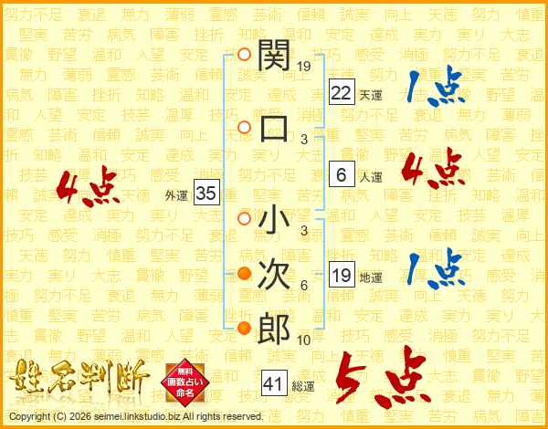 関(19画)口(3画) 小(3画)次(6画)郎(10画)