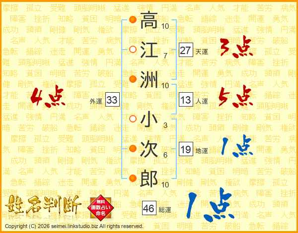 高(10画)江(7画)洲(10画) 小(3画)次(6画)郎(10画)