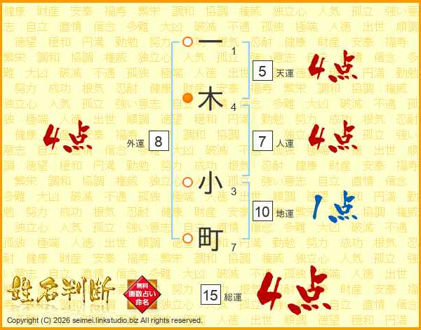 生活面を象徴する運勢です。外部から受ける影響力を表し、結婚運、家庭運や職場、環境への順応性を表します。総運から人運を引いた画数。姓や名が1文字の場合を除く。