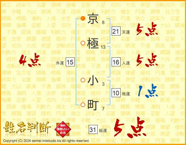 生活面を象徴する運勢です。外部から受ける影響力を表し、結婚運、家庭運や職場、環境への順応性を表します。総運から人運を引いた画数。姓や名が1文字の場合を除く。