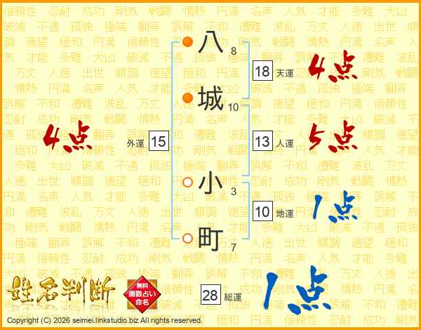 生活面を象徴する運勢です。外部から受ける影響力を表し、結婚運、家庭運や職場、環境への順応性を表します。総運から人運を引いた画数。姓や名が1文字の場合を除く。