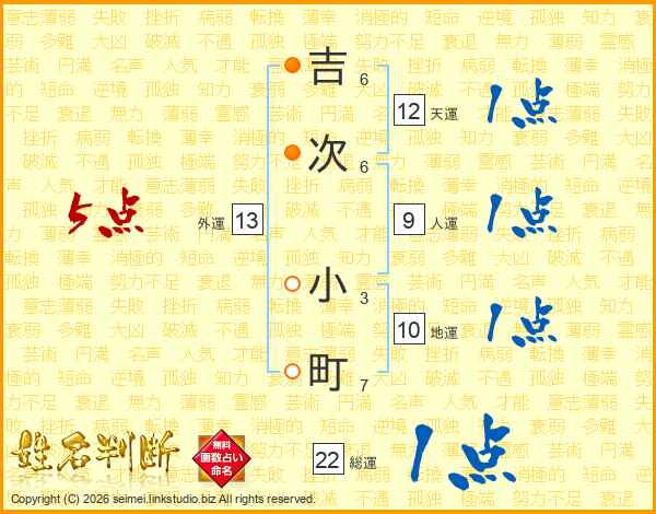 吉(6画)次(6画) 小(3画)町(7画)