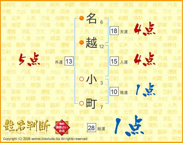 名(6画)越(12画) 小(3画)町(7画)