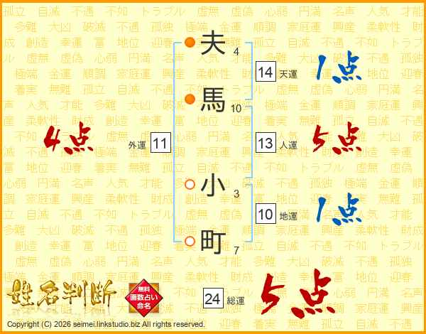 生活面を象徴する運勢です。外部から受ける影響力を表し、結婚運、家庭運や職場、環境への順応性を表します。総運から人運を引いた画数。姓や名が1文字の場合を除く。