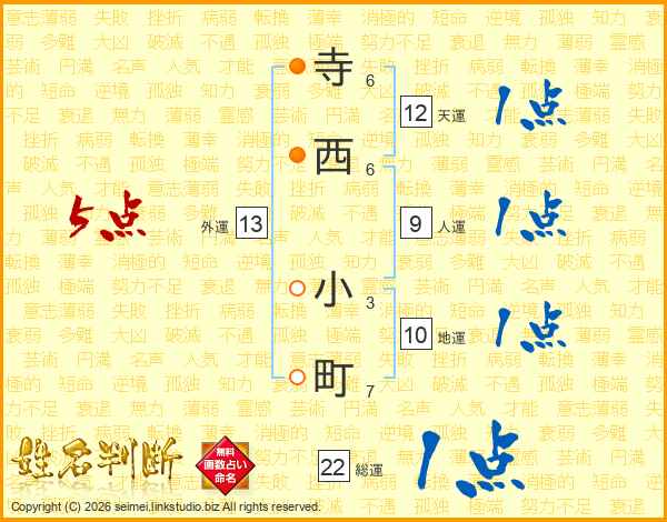生活面を象徴する運勢です。外部から受ける影響力を表し、結婚運、家庭運や職場、環境への順応性を表します。総運から人運を引いた画数。姓や名が1文字の場合を除く。