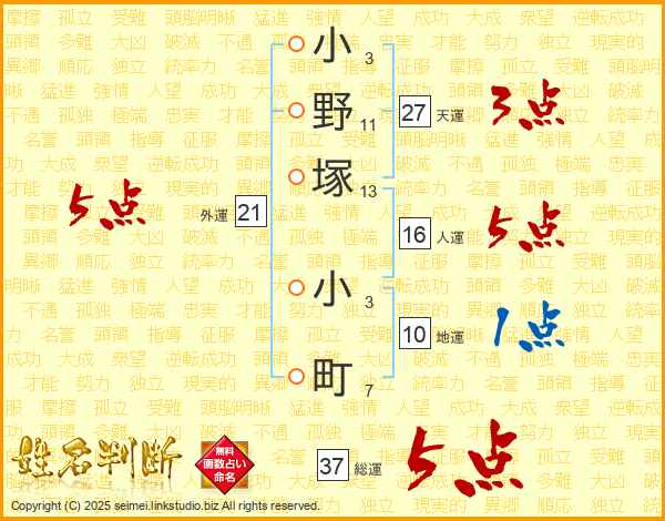 小(3画)野(11画)塚(13画) 小(3画)町(7画)