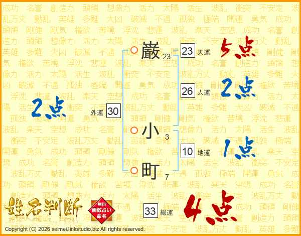 生活面を象徴する運勢です。外部から受ける影響力を表し、結婚運、家庭運や職場、環境への順応性を表します。総運から人運を引いた画数。姓や名が1文字の場合を除く。