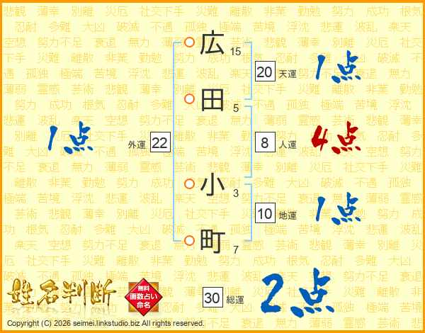 生活面を象徴する運勢です。外部から受ける影響力を表し、結婚運、家庭運や職場、環境への順応性を表します。総運から人運を引いた画数。姓や名が1文字の場合を除く。