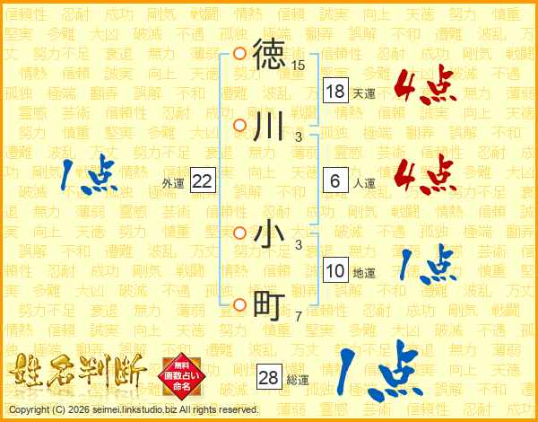 徳(15画)川(3画) 小(3画)町(7画)