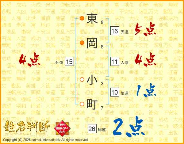 生活面を象徴する運勢です。外部から受ける影響力を表し、結婚運、家庭運や職場、環境への順応性を表します。総運から人運を引いた画数。姓や名が1文字の場合を除く。