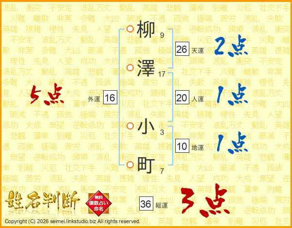 生活面を象徴する運勢です。外部から受ける影響力を表し、結婚運、家庭運や職場、環境への順応性を表します。総運から人運を引いた画数。姓や名が1文字の場合を除く。