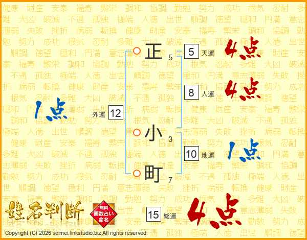 生活面を象徴する運勢です。外部から受ける影響力を表し、結婚運、家庭運や職場、環境への順応性を表します。総運から人運を引いた画数。姓や名が1文字の場合を除く。
