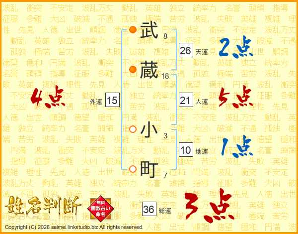 生活面を象徴する運勢です。外部から受ける影響力を表し、結婚運、家庭運や職場、環境への順応性を表します。総運から人運を引いた画数。姓や名が1文字の場合を除く。