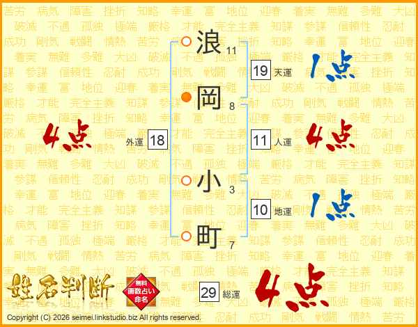 生活面を象徴する運勢です。外部から受ける影響力を表し、結婚運、家庭運や職場、環境への順応性を表します。総運から人運を引いた画数。姓や名が1文字の場合を除く。