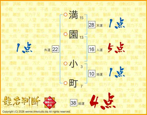 生活面を象徴する運勢です。外部から受ける影響力を表し、結婚運、家庭運や職場、環境への順応性を表します。総運から人運を引いた画数。姓や名が1文字の場合を除く。