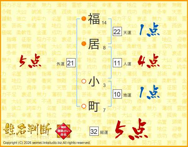 生活面を象徴する運勢です。外部から受ける影響力を表し、結婚運、家庭運や職場、環境への順応性を表します。総運から人運を引いた画数。姓や名が1文字の場合を除く。