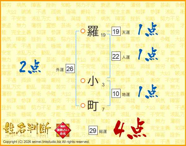 生活面を象徴する運勢です。外部から受ける影響力を表し、結婚運、家庭運や職場、環境への順応性を表します。総運から人運を引いた画数。姓や名が1文字の場合を除く。
