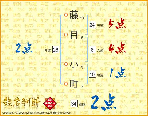 藤目小町さんの総運は34画の2点!