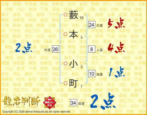 藪本小町さんの総運は34画の2点!