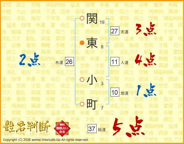 生活面を象徴する運勢です。外部から受ける影響力を表し、結婚運、家庭運や職場、環境への順応性を表します。総運から人運を引いた画数。姓や名が1文字の場合を除く。