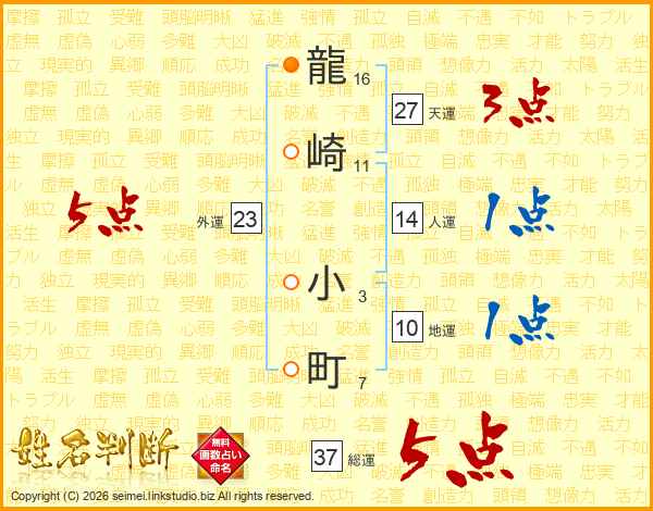 生活面を象徴する運勢です。外部から受ける影響力を表し、結婚運、家庭運や職場、環境への順応性を表します。総運から人運を引いた画数。姓や名が1文字の場合を除く。
