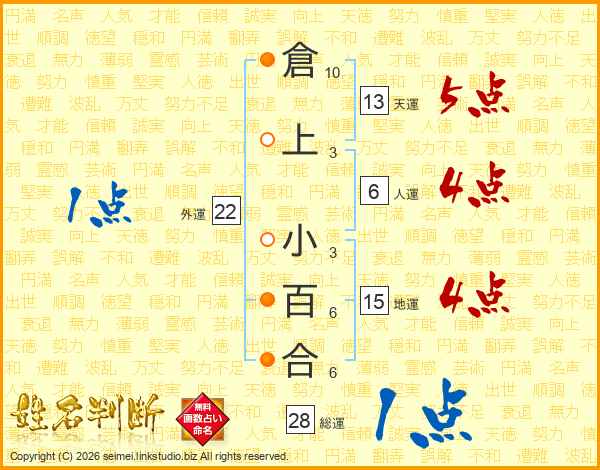 倉(10画)上(3画) 小(3画)百(6画)合(6画)