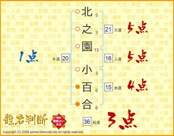 北(5画)之(3画)園(13画) 小(3画)百(6画)合(6画)