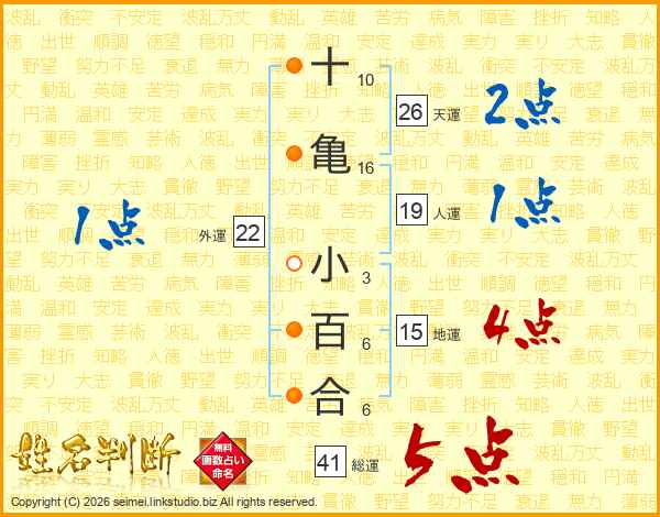 生活面を象徴する運勢です。外部から受ける影響力を表し、結婚運、家庭運や職場、環境への順応性を表します。総運から人運を引いた画数。姓や名が1文字の場合を除く。