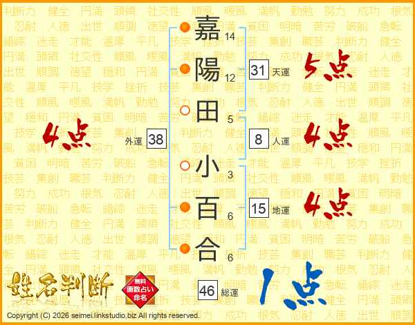 嘉(14画)陽(12画)田(5画) 小(3画)百(6画)合(6画)