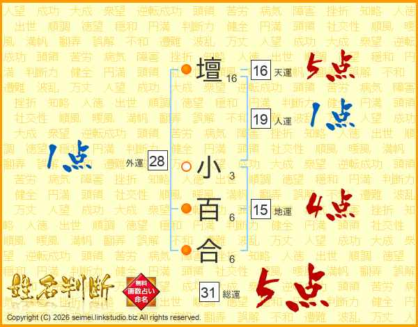 生活面を象徴する運勢です。外部から受ける影響力を表し、結婚運、家庭運や職場、環境への順応性を表します。総運から人運を引いた画数。姓や名が1文字の場合を除く。
