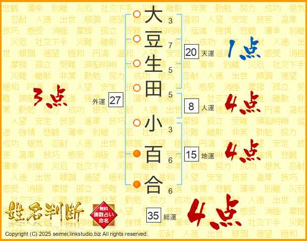 大(3画)豆(7画)生(5画)田(5画) 小(3画)百(6画)合(6画)