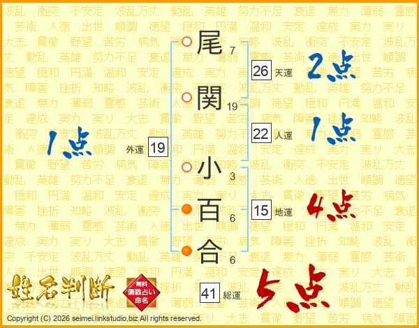 尾(7画)関(19画) 小(3画)百(6画)合(6画)