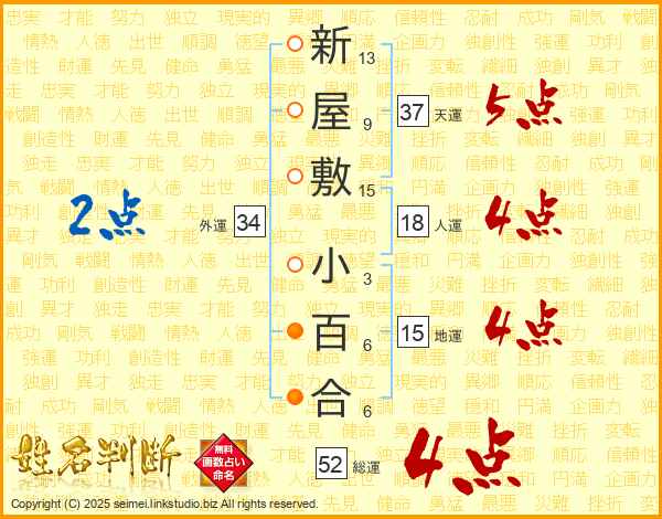 新(13画)屋(9画)敷(15画) 小(3画)百(6画)合(6画)