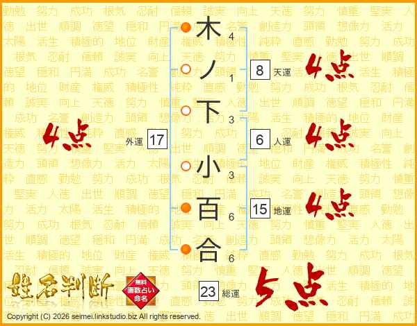 木(4画)ノ(1画)下(3画) 小(3画)百(6画)合(6画)