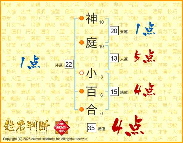 生活面を象徴する運勢です。外部から受ける影響力を表し、結婚運、家庭運や職場、環境への順応性を表します。総運から人運を引いた画数。姓や名が1文字の場合を除く。