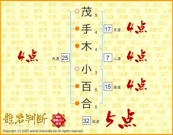 茂(9画)手(4画)木(4画) 小(3画)百(6画)合(6画)