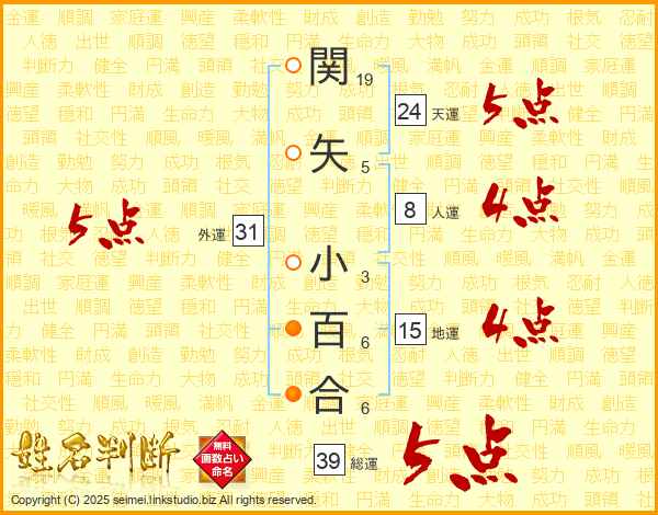 関(19画)矢(5画) 小(3画)百(6画)合(6画)