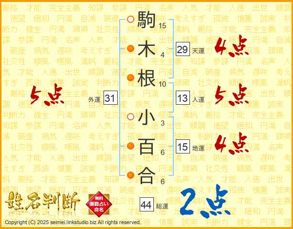 駒(15画)木(4画)根(10画) 小(3画)百(6画)合(6画)