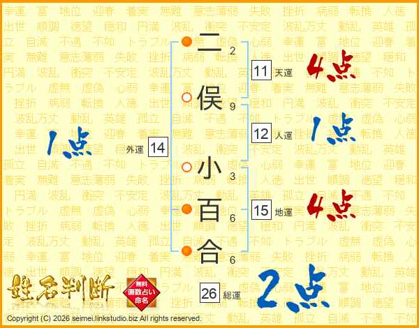 生活面を象徴する運勢です。外部から受ける影響力を表し、結婚運、家庭運や職場、環境への順応性を表します。総運から人運を引いた画数。姓や名が1文字の場合を除く。